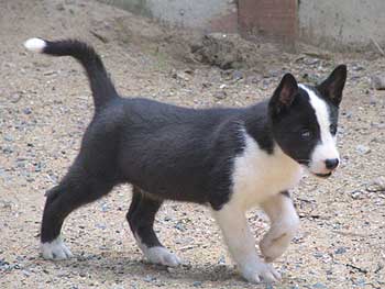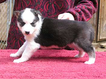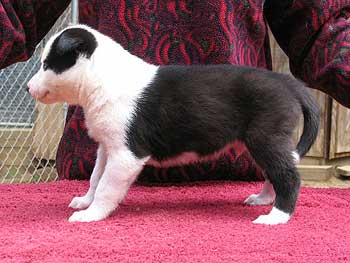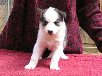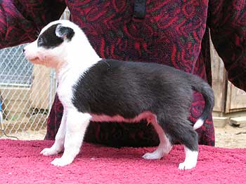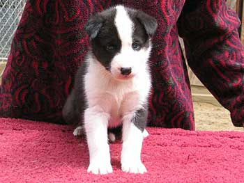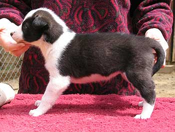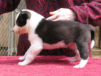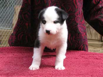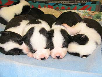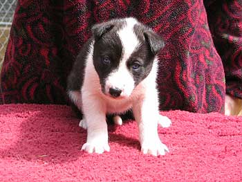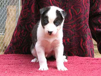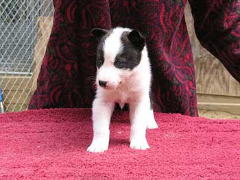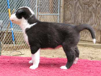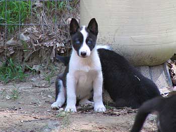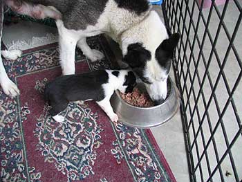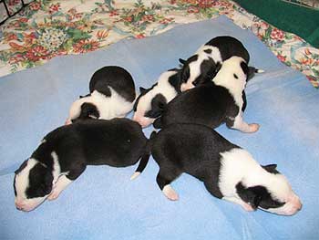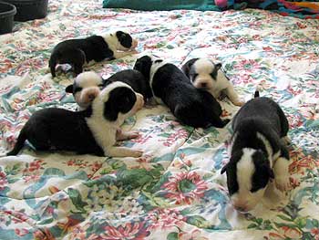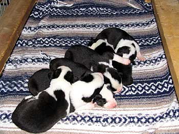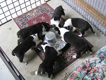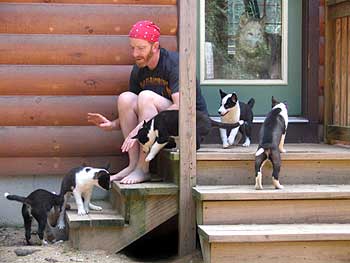 Bob and 5 of the pups on the back steps (Mischa looking through the window)